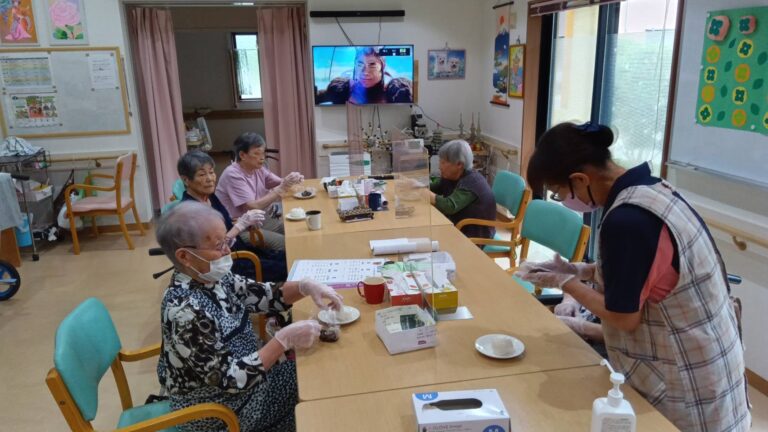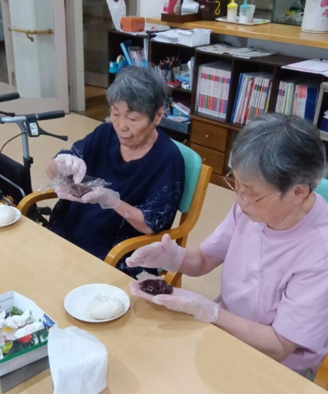 シニアホームせせらぎの建物内に併設されているデイサービスクローバーでは、おはぎ作りを利用者様と一緒に行いました。