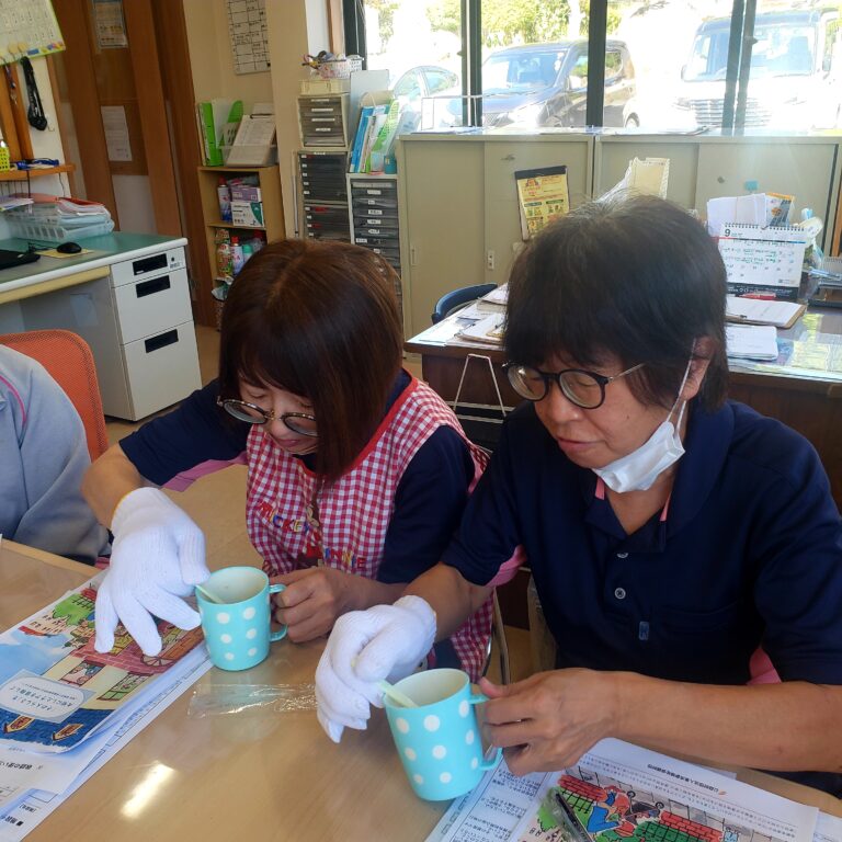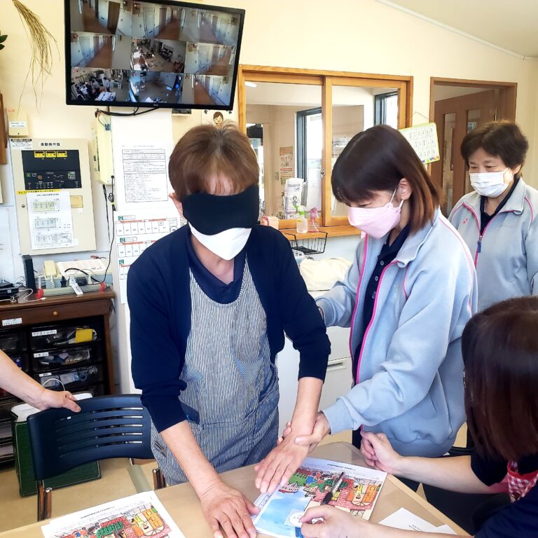 身体拘束適正化の研修では、手に軍手を重ねてはめて、手の動きを制限した状態でコップのお茶をすくって飲んだり、アイマスクと耳栓をつけて介助で移動したりと、拘束された状態を実際に体験してみて、身体拘束された方の気持ちを考えてみました。