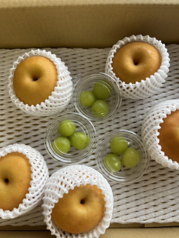 甘くて皮ごと食べられるシャインマスカットと、みずみずしいさっぱりした味わいの梨を、夕食のデザートに提供しました。