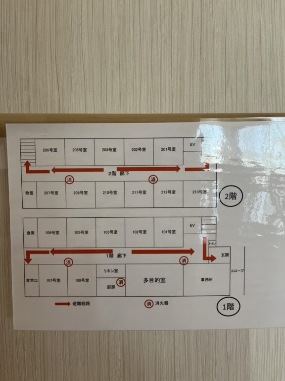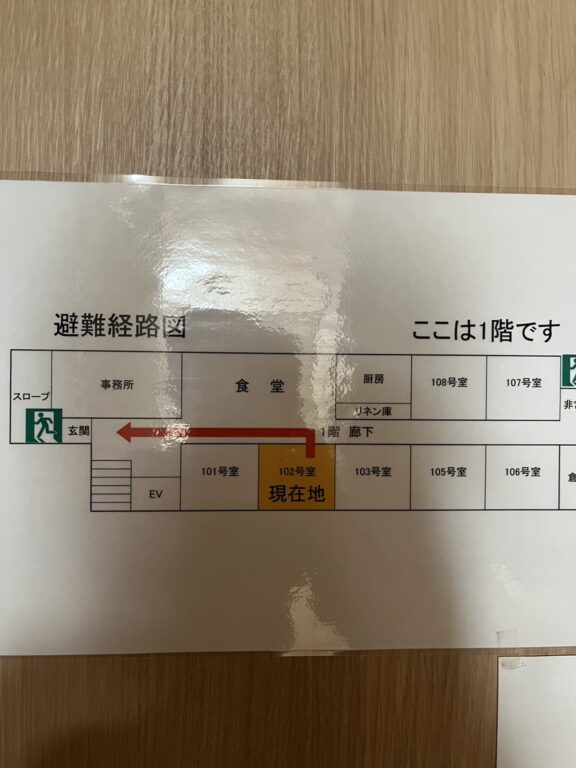 ことぶきの居室の扉には避難経路が貼ってあるので、非常事態の時に逃げる経路が確認できます。