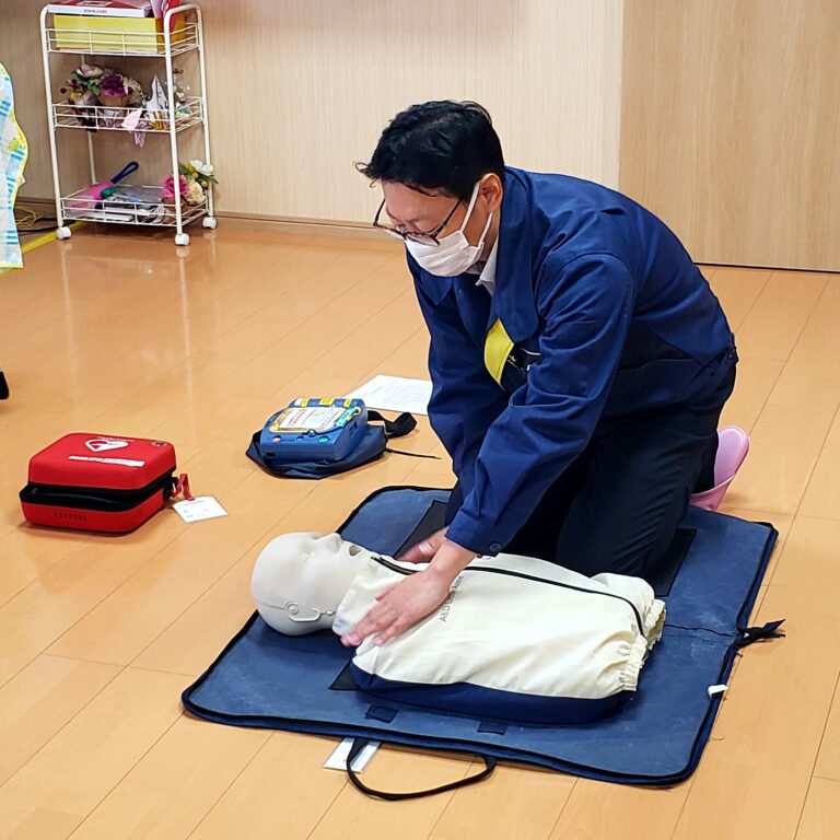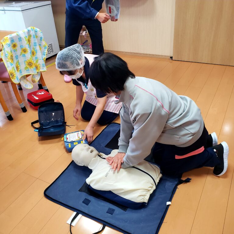 AEDからの心臓マッサージのリズムに合わせてマッサージを行うことや、一分間に100回、5cmの深さまでマッサージ実施することなど教えて頂きました。