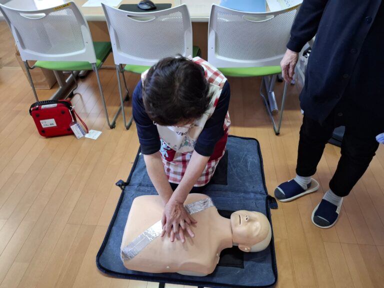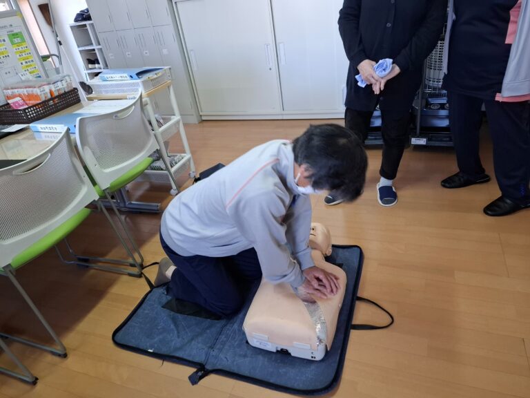 高齢者施設において、適切な胸骨圧迫とAEDの使用は、命を救うための命綱です。今後も継続してトレーニングを重ね、ご入居者様が安心して暮らせるホームづくりに努めてまいります。