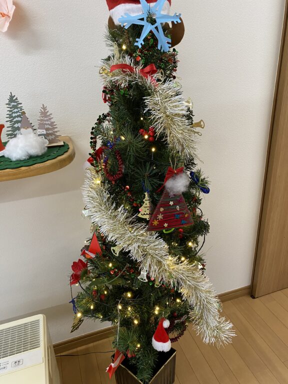 師走を迎え、施設内は本格的なクリスマスシーズンを迎えました!エントランスから共有スペース、食堂まで、きらびやかな電飾のクリスマスツリーと、手作りの可愛らしいオーナメントが飾られ、華やかな雰囲気に包まれています。