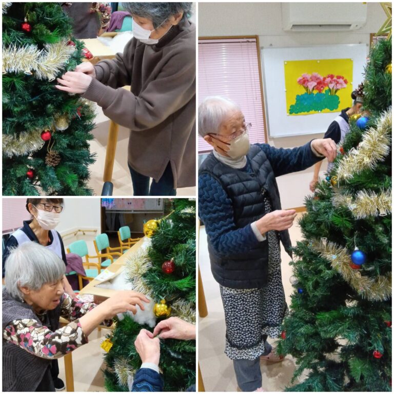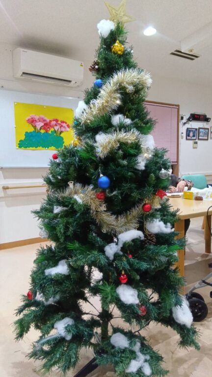 まずクリスマスツリーの飾り付けを利用者様達が、「これはどこに飾ろう?」「この飾りかわいいね」「みんなで飾ると楽しいね」等おしゃべりしながら、ツリーを完成させました。