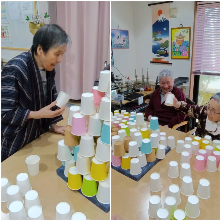 最初は座って行っていたのが、段々と本気になっていって、少しでも高く積み上げられるように立ちあがって崩さないように、慎重に紙コップを組み立てていきました。